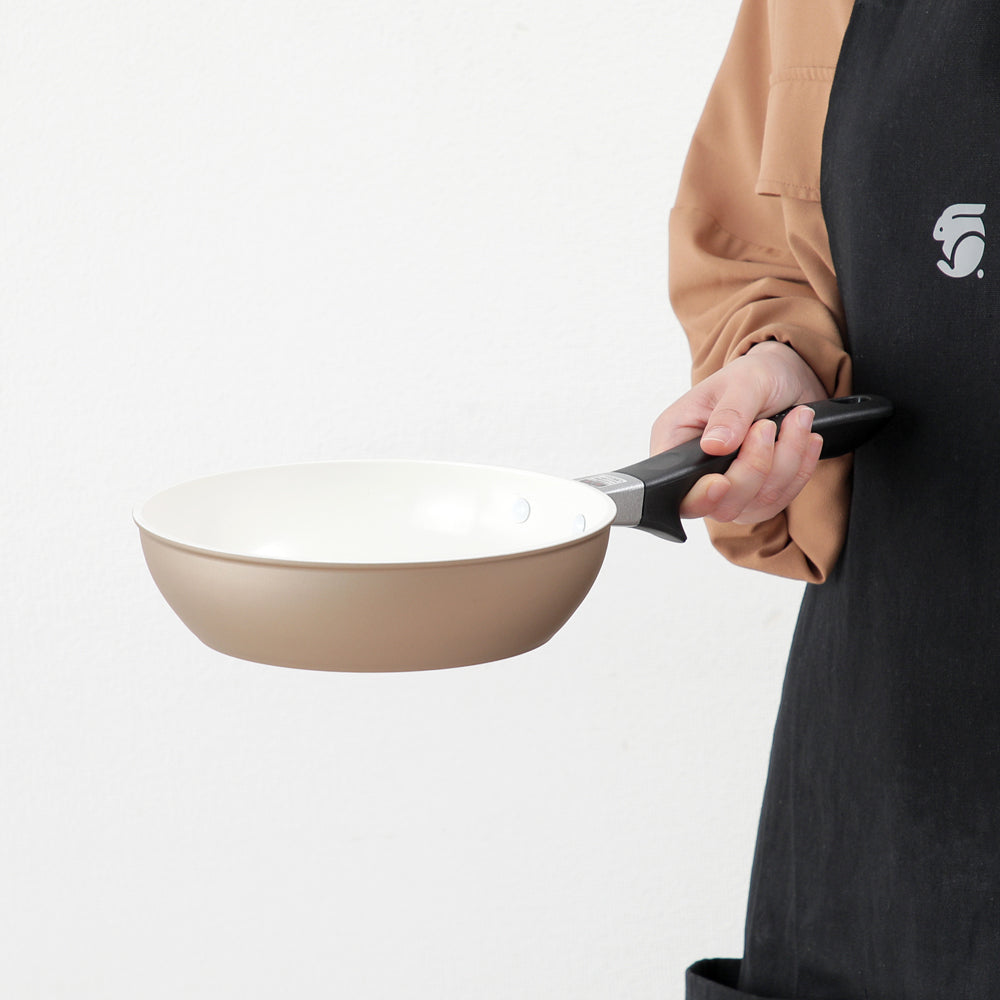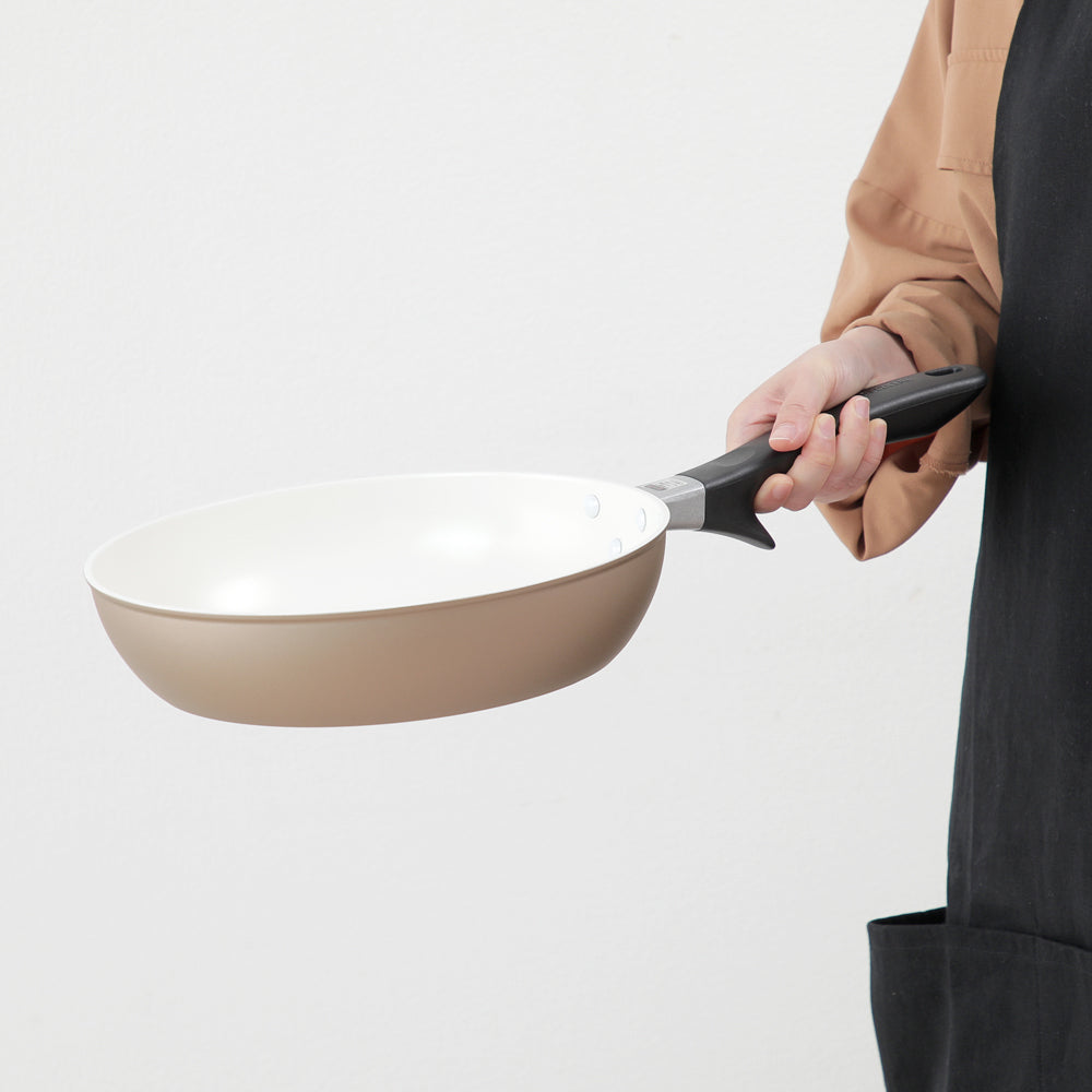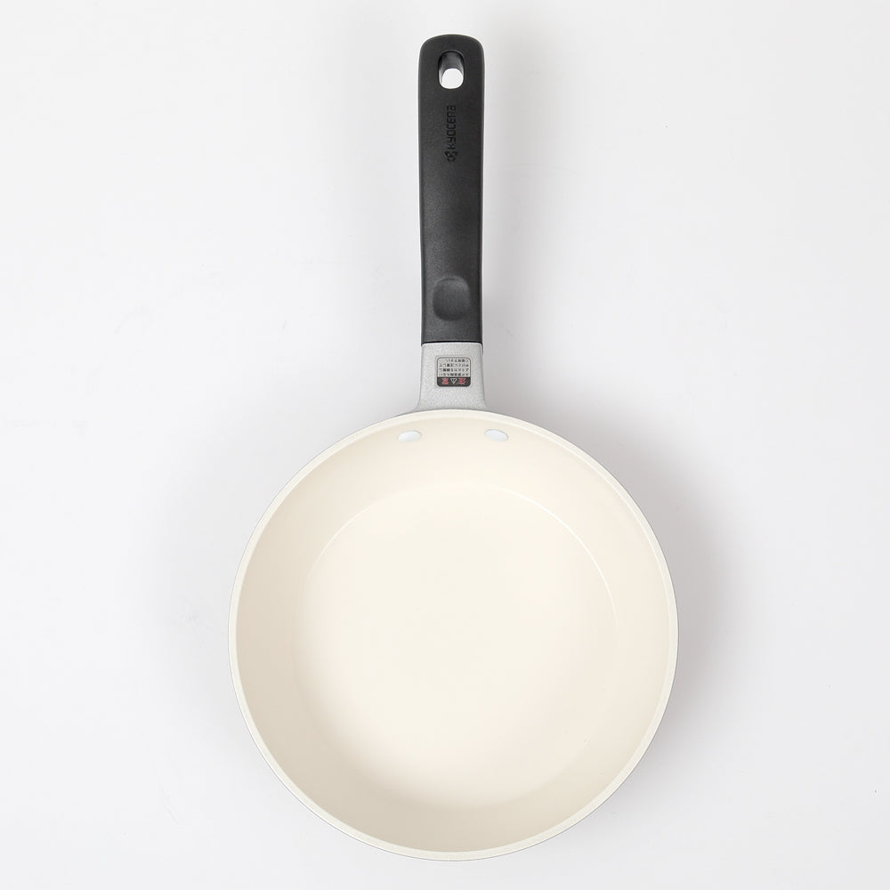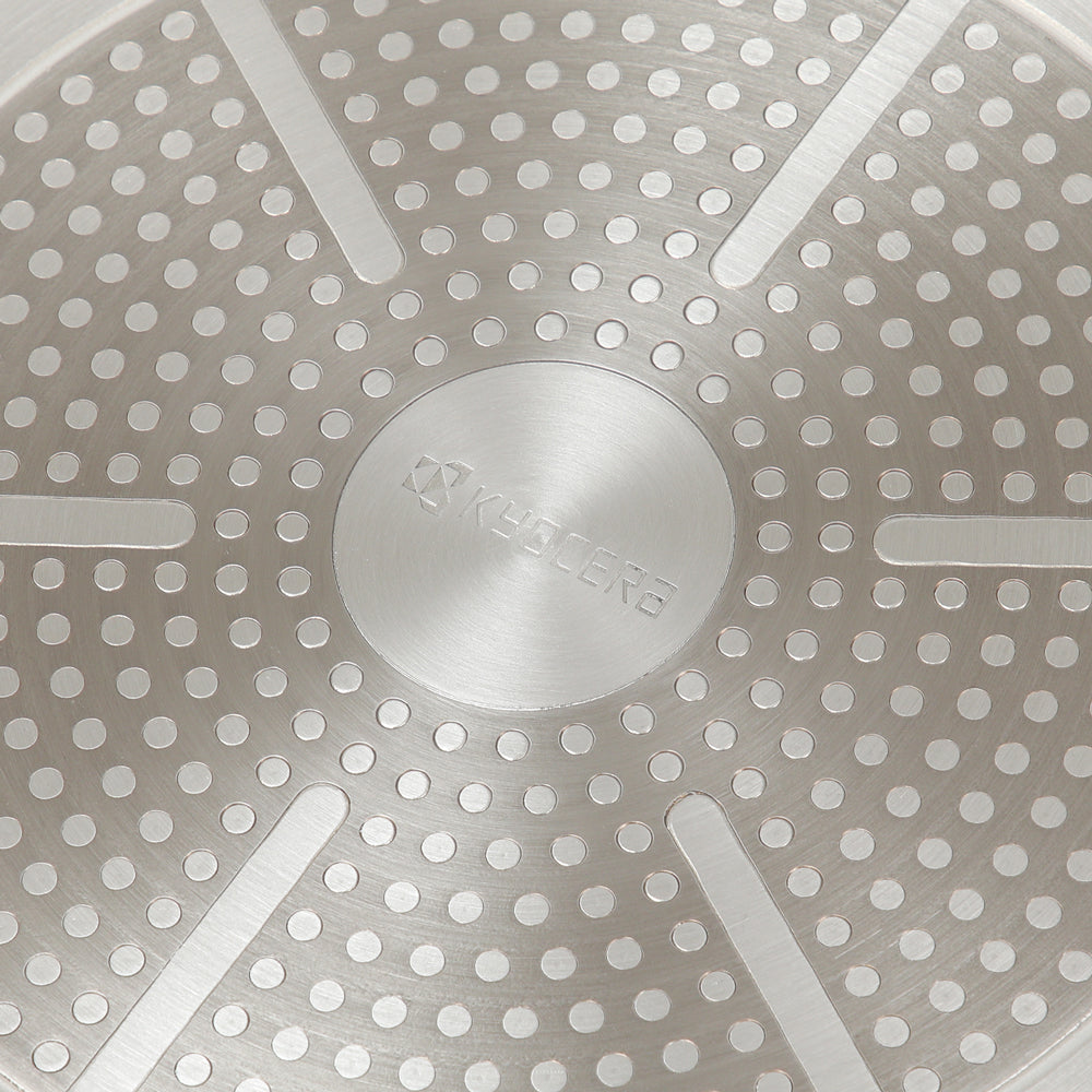 内面は京セラ独自のセラミック加工でコーティングしてあり熱伝導が良く、さらに遠赤外線効果が加わり中までしっかり火が通ります。遠赤効果で、ベタベタと水っぽい仕上がりにはなりにくいところがコーティングフライパンの中でも優れているとこです。少量の油でスルスルとくっつきにくいのが特徴のセラミックコーティングですが、人体や環境に影響を及ぼす化学物質(PTFE/PFOA)は不使用で安全安心です。