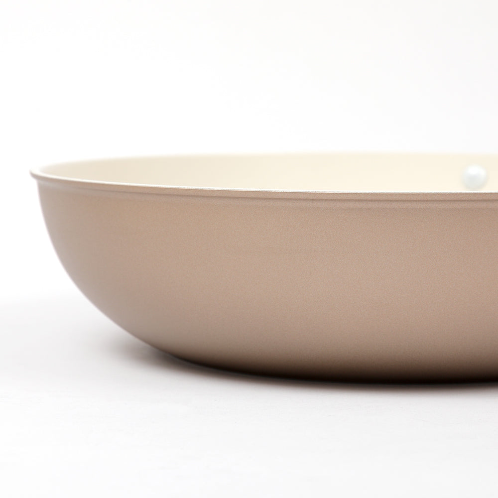 真っ白の内面コーティングは清潔感がありキッチンを明るくオシャレにしてくれますが、お料理の焼け具合が見やすくてソースなどを煮詰めるイタリアンやフレンチを良く作る方にもおすすめです。ボディがシャンパンゴールドのようなベージュで落ち着いた色の中に高級感も感じられます。