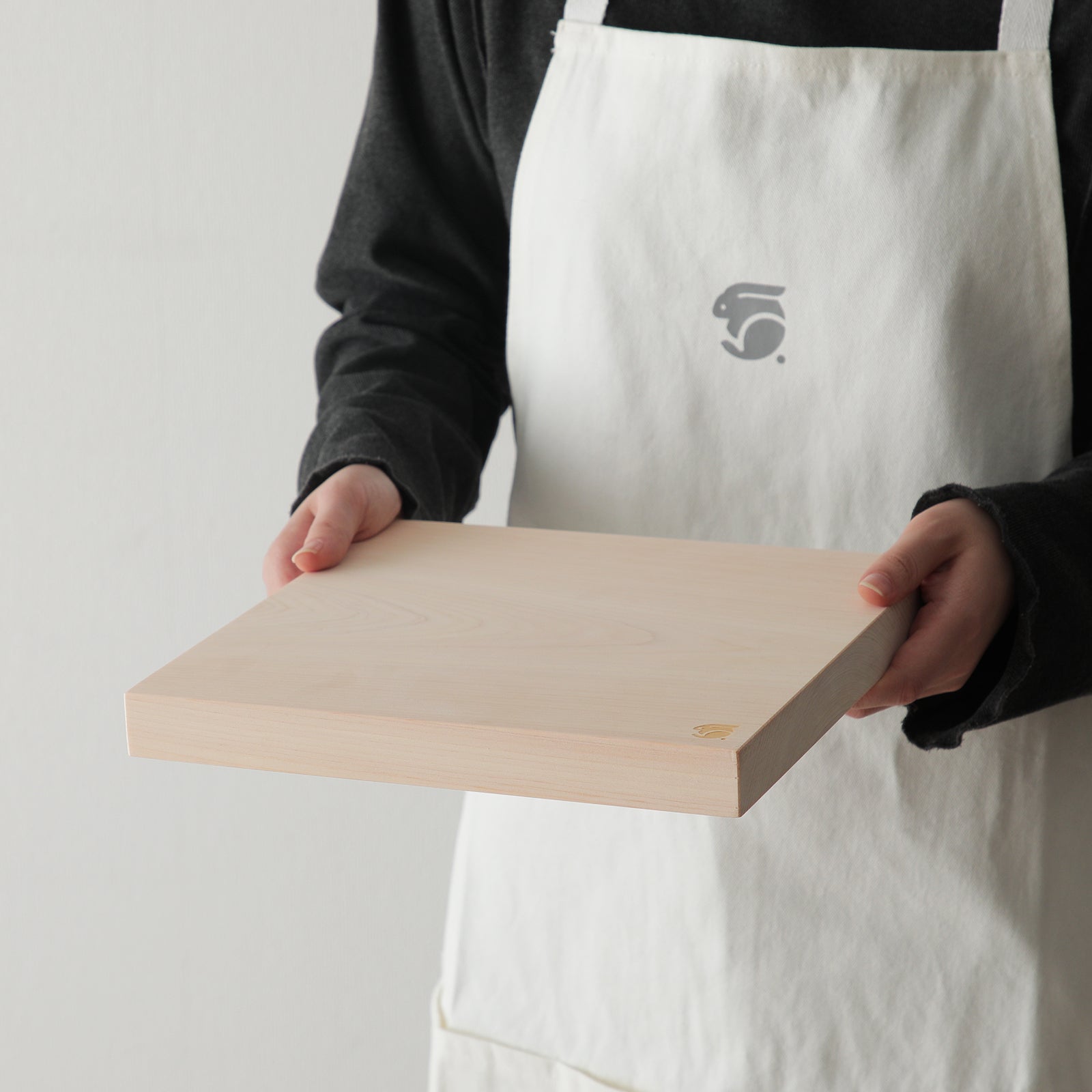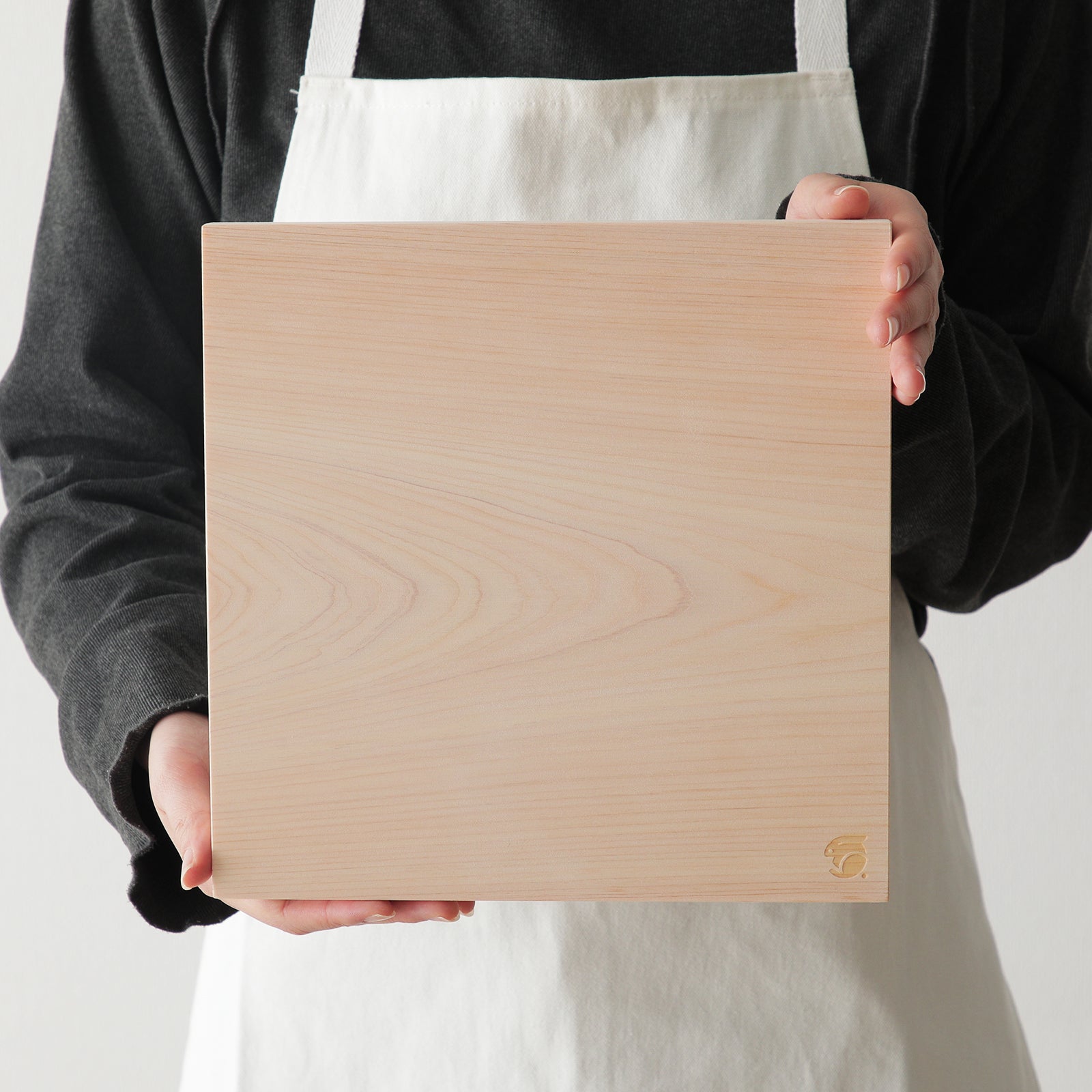ひのき素材は見た目よりもとても軽くて、具材を切ったらお鍋まで移動もラクラク。正方形だから上下左右のあらゆる面から使えて便利な当店おすすめの台所道具です。