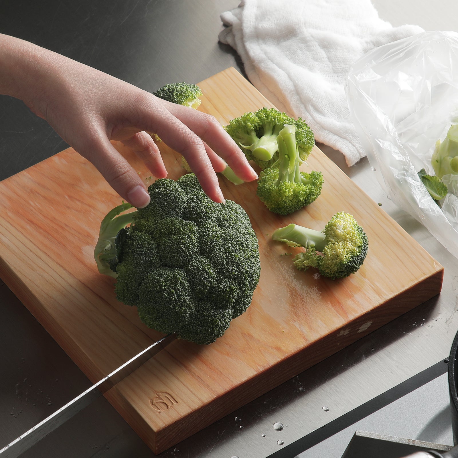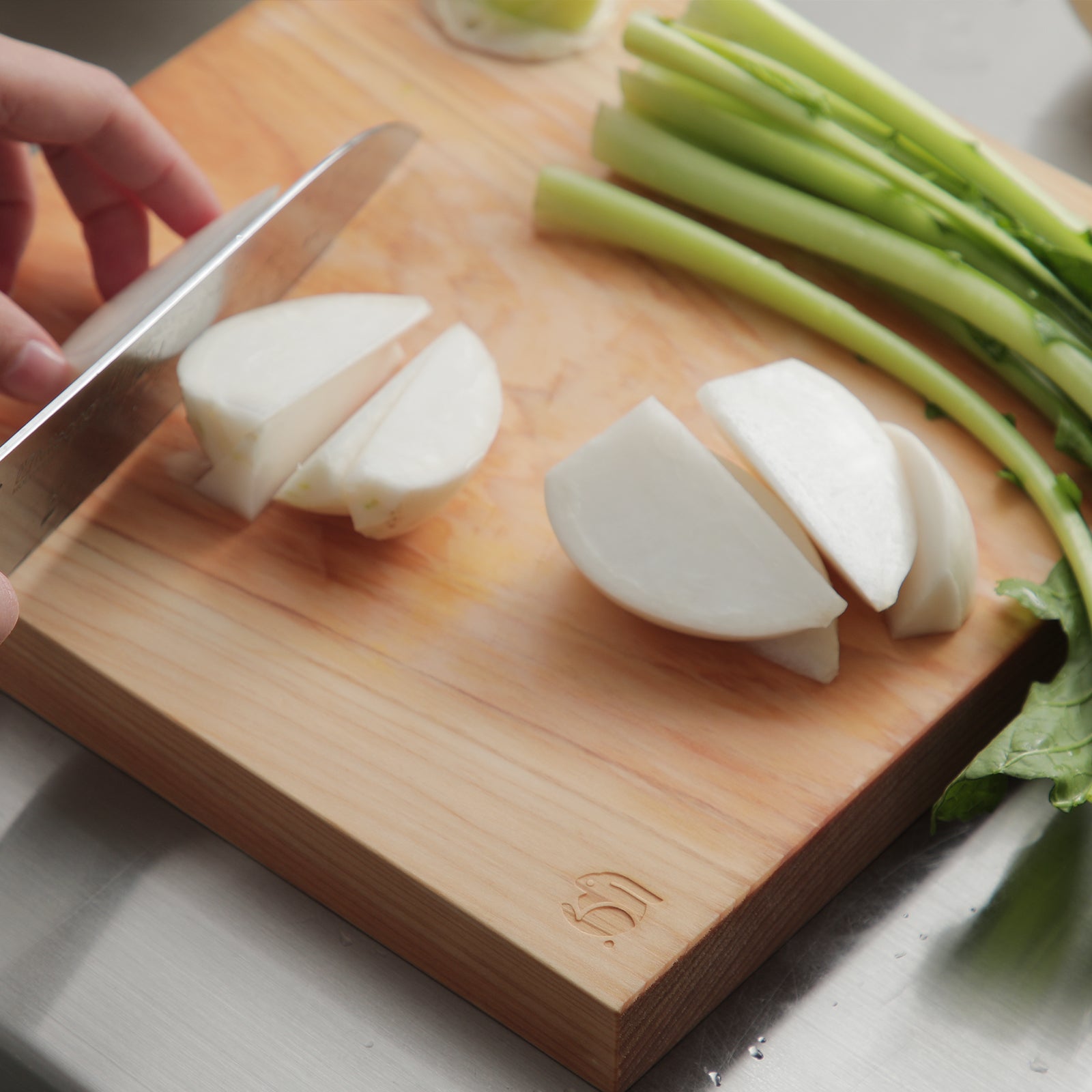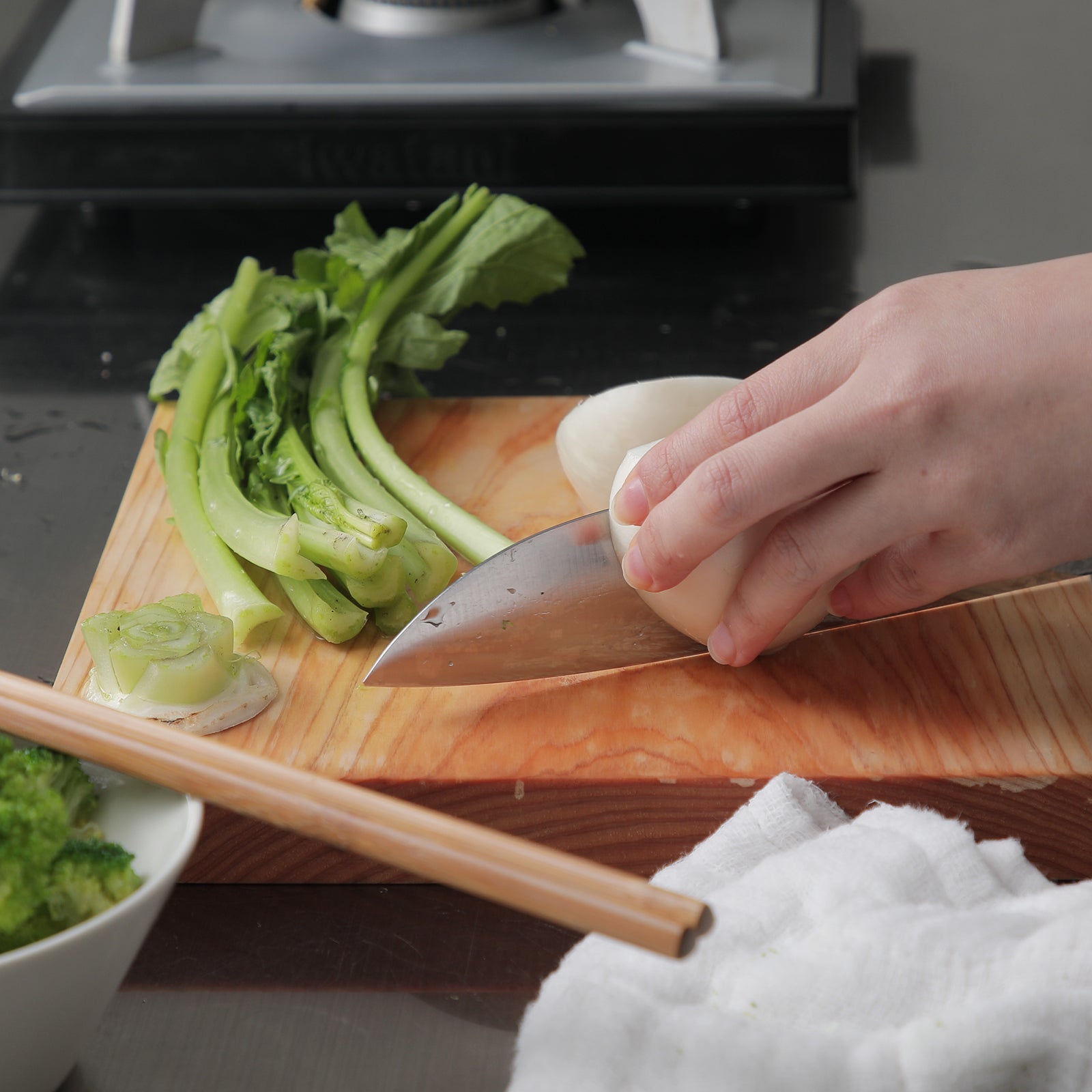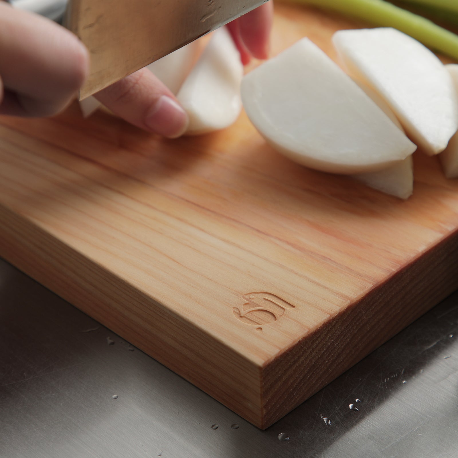 ヒノキの良い香りはもちろん、トントントン…という音が心地よい昔ながらの”料理の音”が聞こえます。柔らかく弾力性があるので包丁の刃を傷めないのもヒノキのまな板の特徴です。