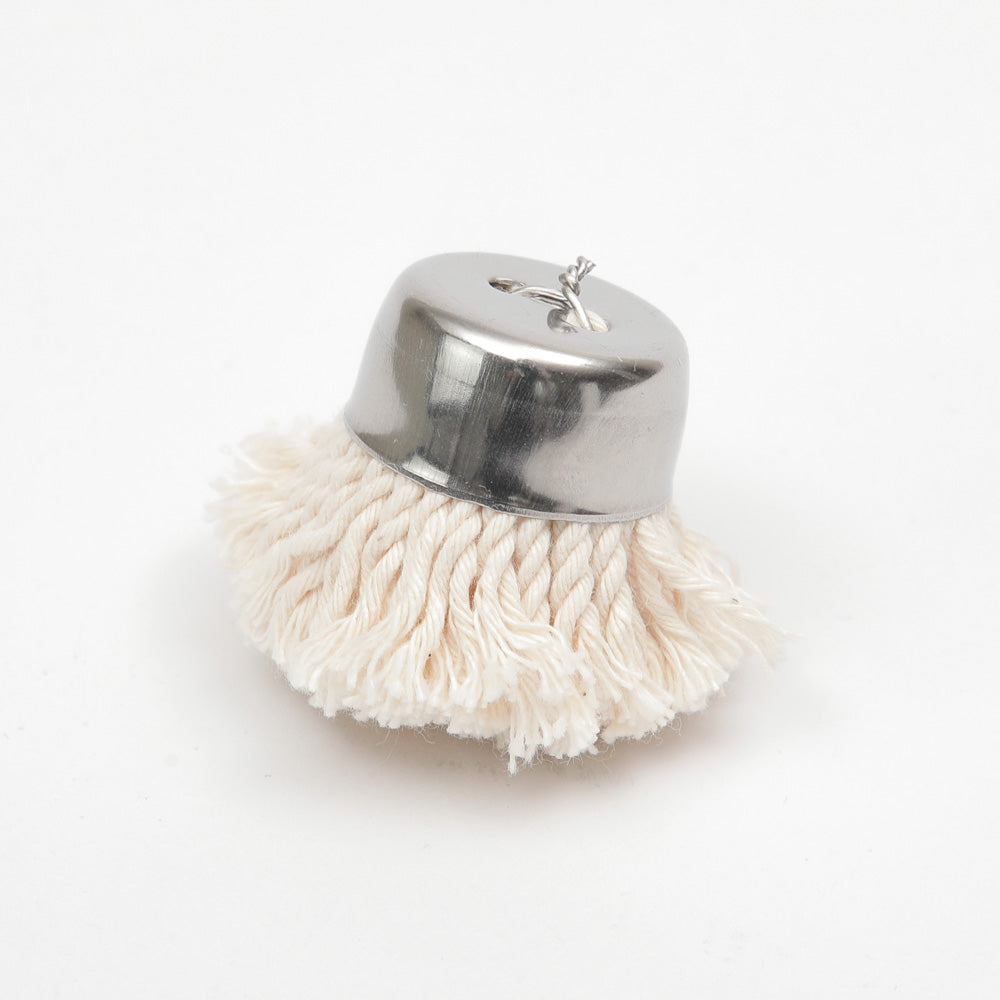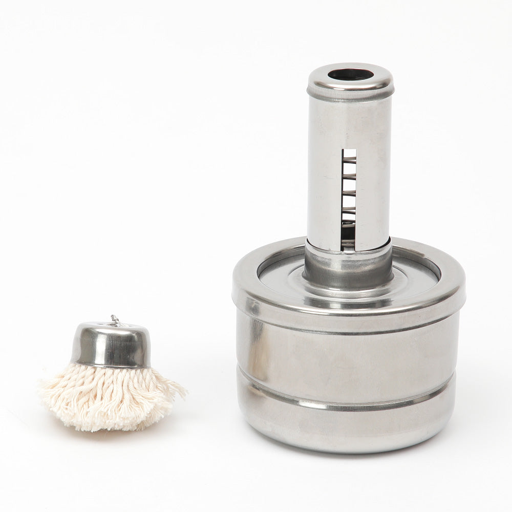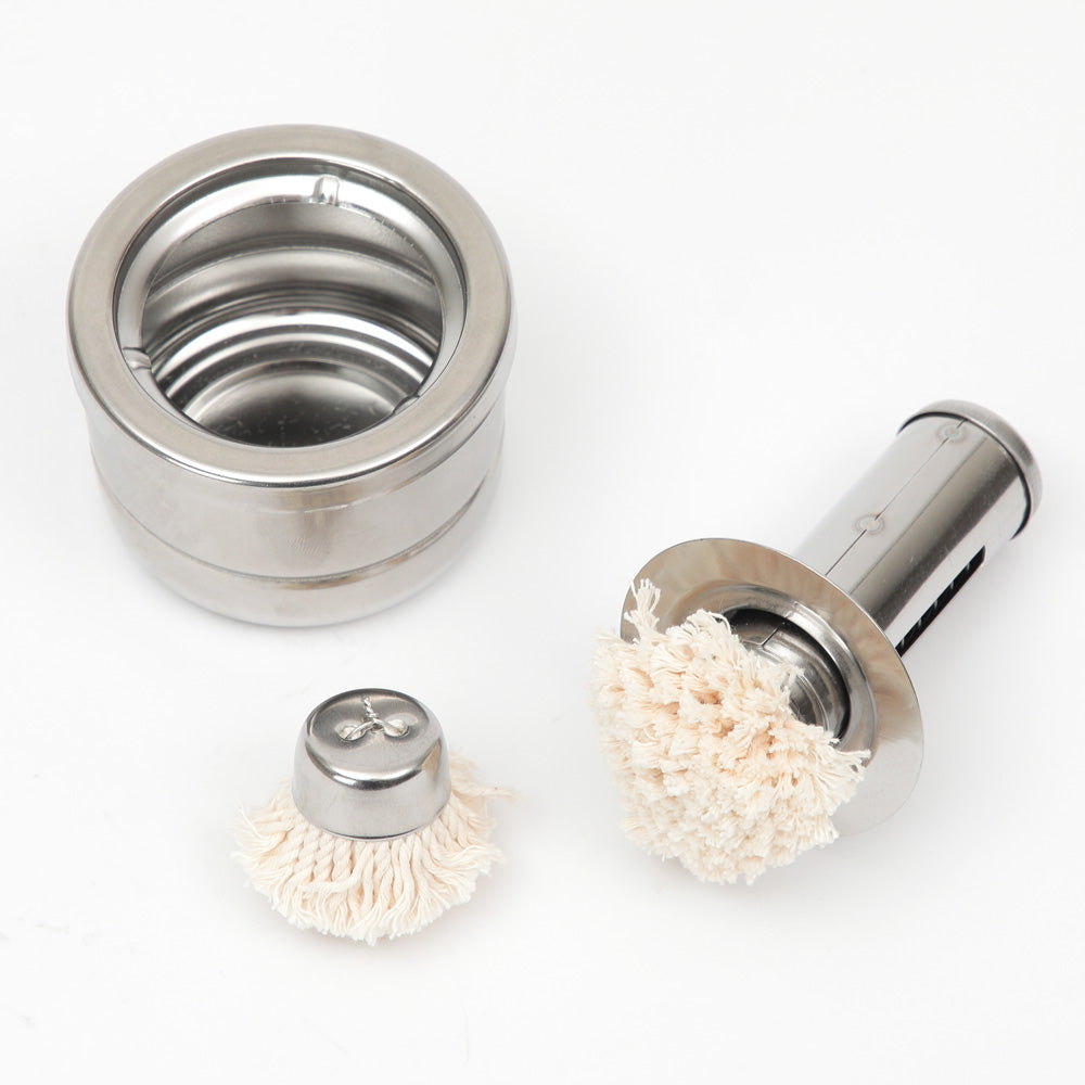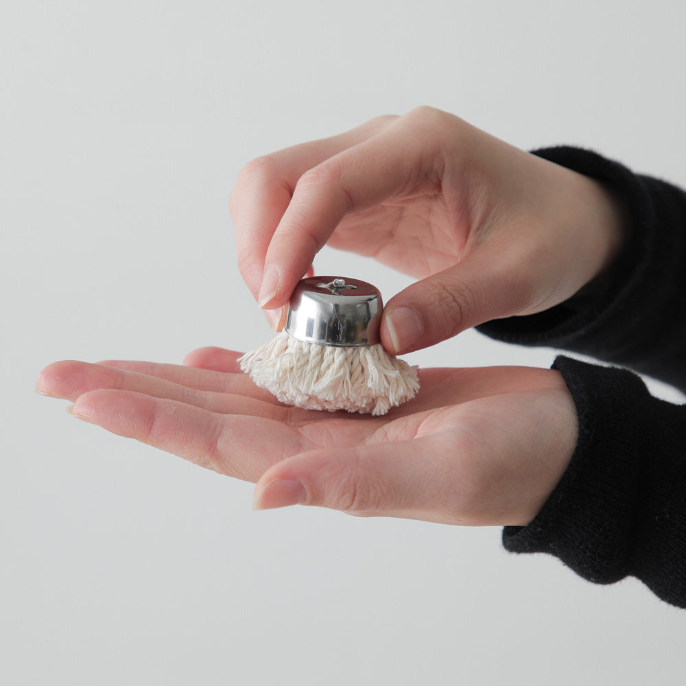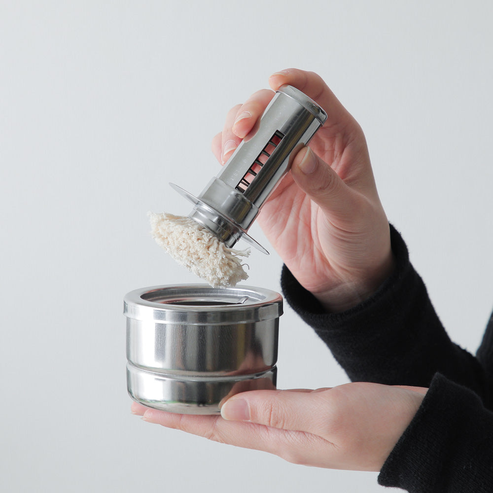 バネ式の設計で使用しない時もひも部分を浮かせた状態で保持でき衛生的。また、油をためる容器に蓋のようにセットされるので、小さなオイルポットとしても活躍します。油をしみこませるひもは交換可能で、当店では交換用のひもを一つセットでお届けします。