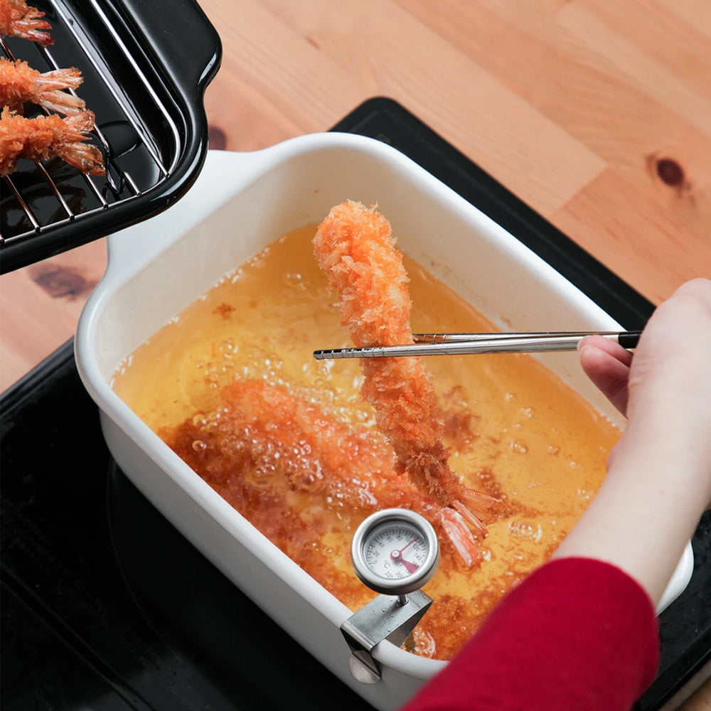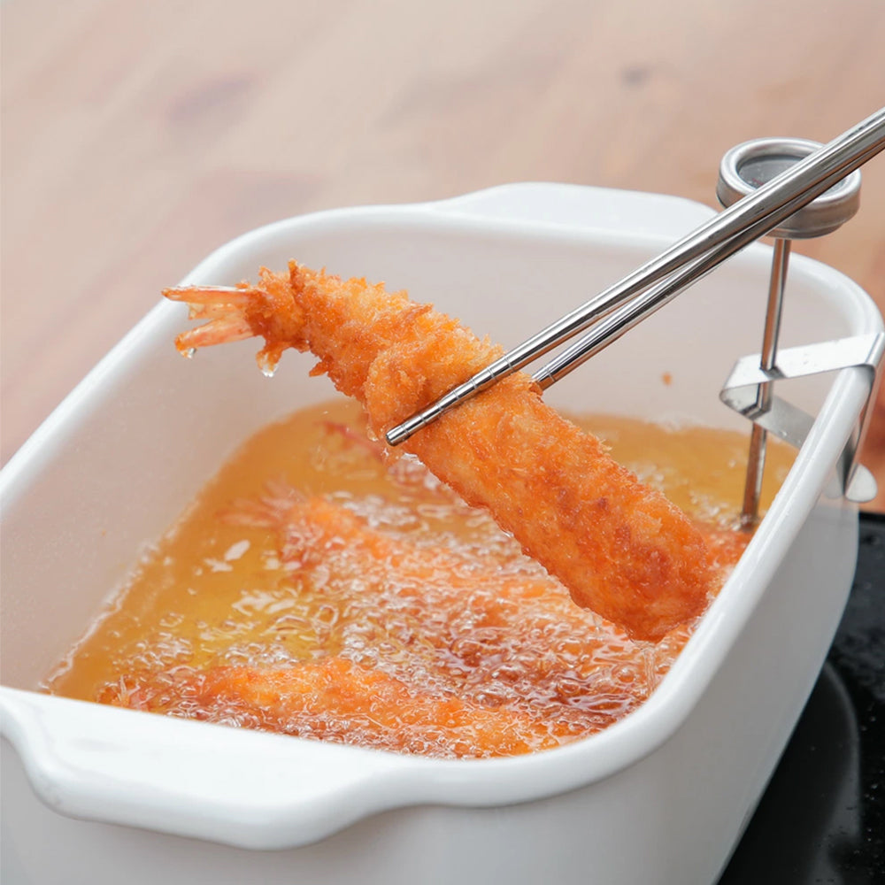 長方形だから少ない油でもしっかりと揚げられて収納の便利。コンロの奥の角など、わずかなスペースに置けます。お弁当用などにコンロ横にいつもスタンバイ。