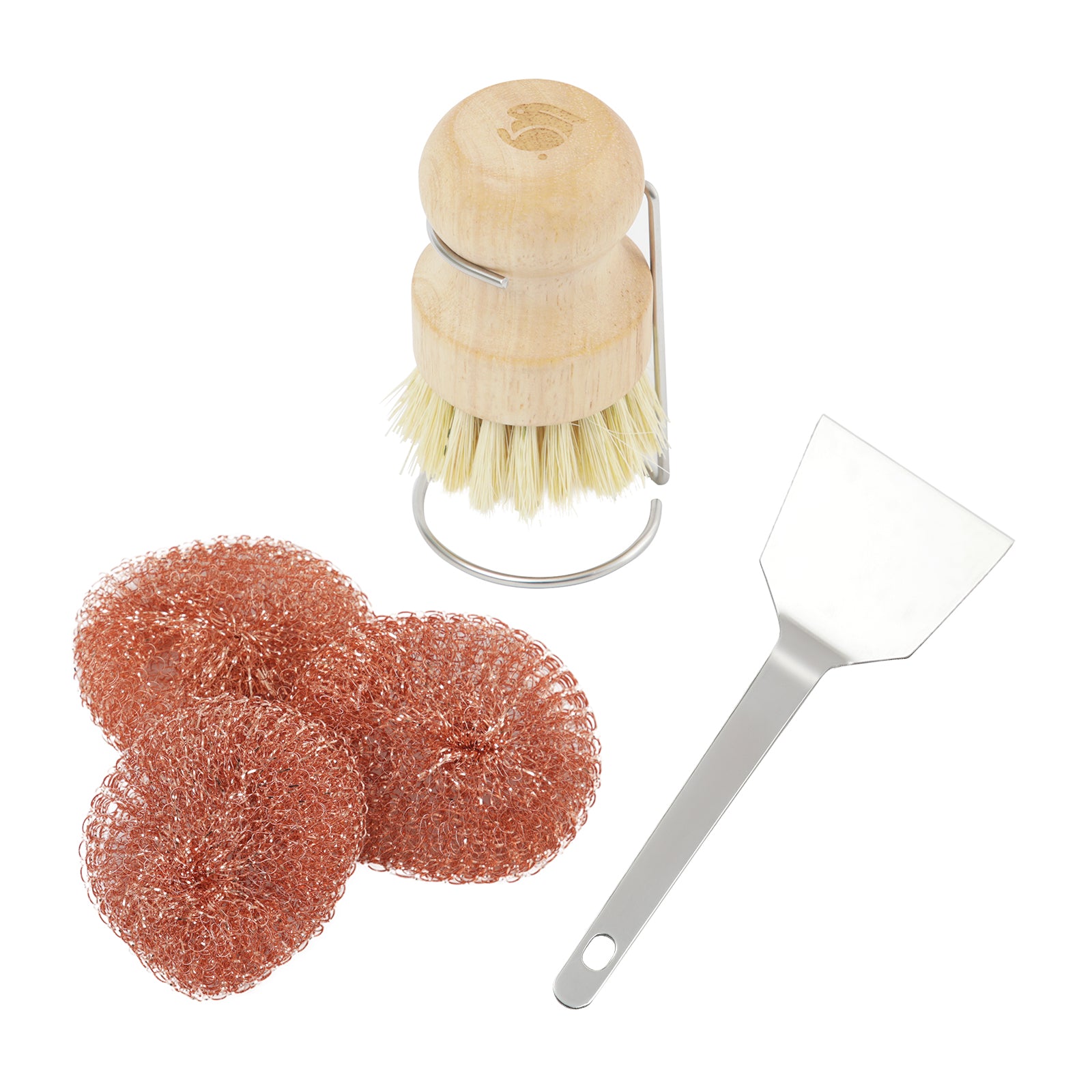 ホルダー付きのキッチンブラシは当店オリジナル。鉄フライパンの日頃のお手入れにちょうどいい固さです。力を入れてゴシゴシするとカタチが崩れる事もありますが、手直ししてから乾かしていただければ大丈夫です。焦げ付きがあまりない時はこちらで洗ってください。