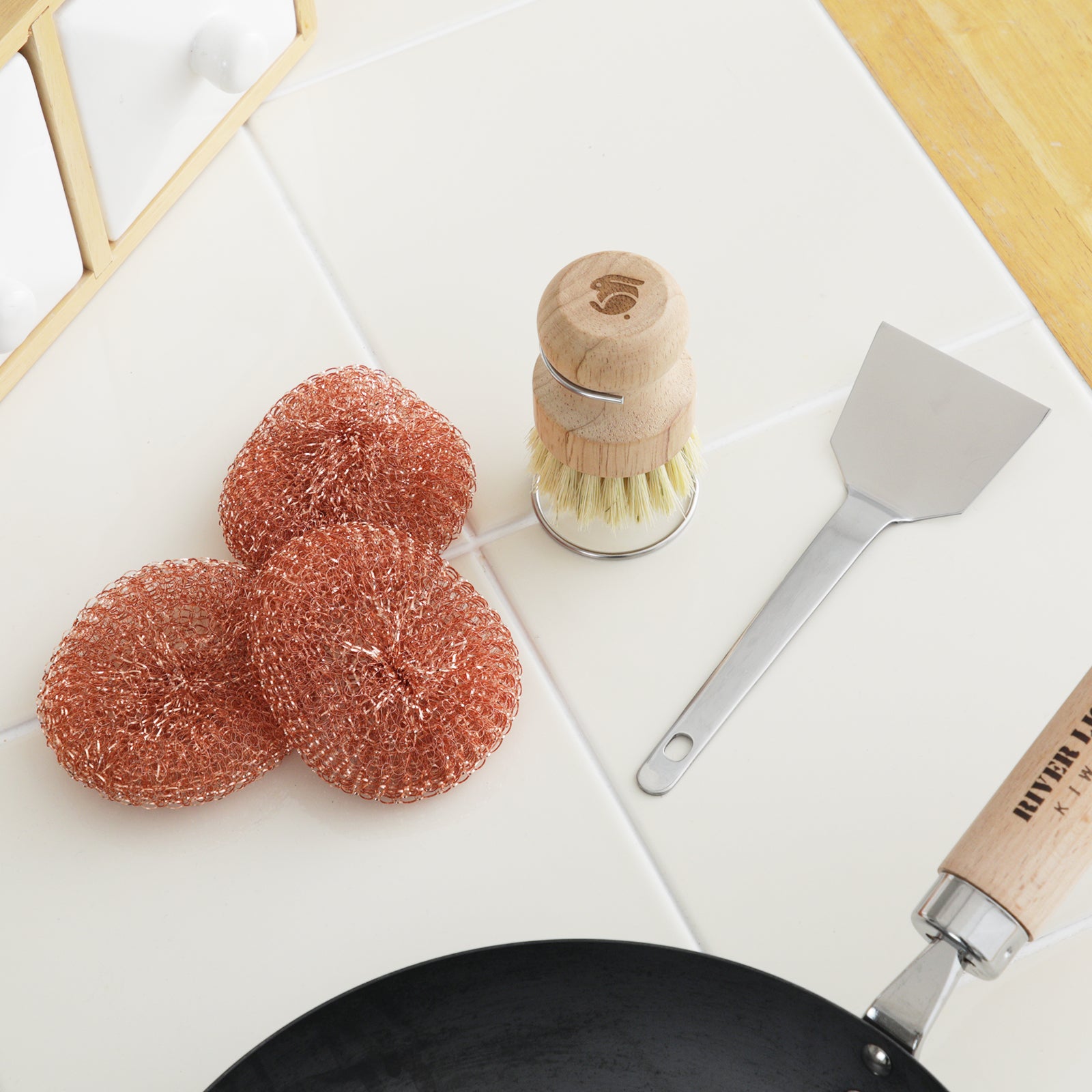 当店のリバーライトの商品におまけでついている純銅製タワシは、焦げ付きがある時にゴシゴシするのに便利。よくお客様に新しいものが欲しいけれど販売していますか?とお問い合わせの多い商品です。こちらのタワシを3個セット。ストックしておけば安心です。