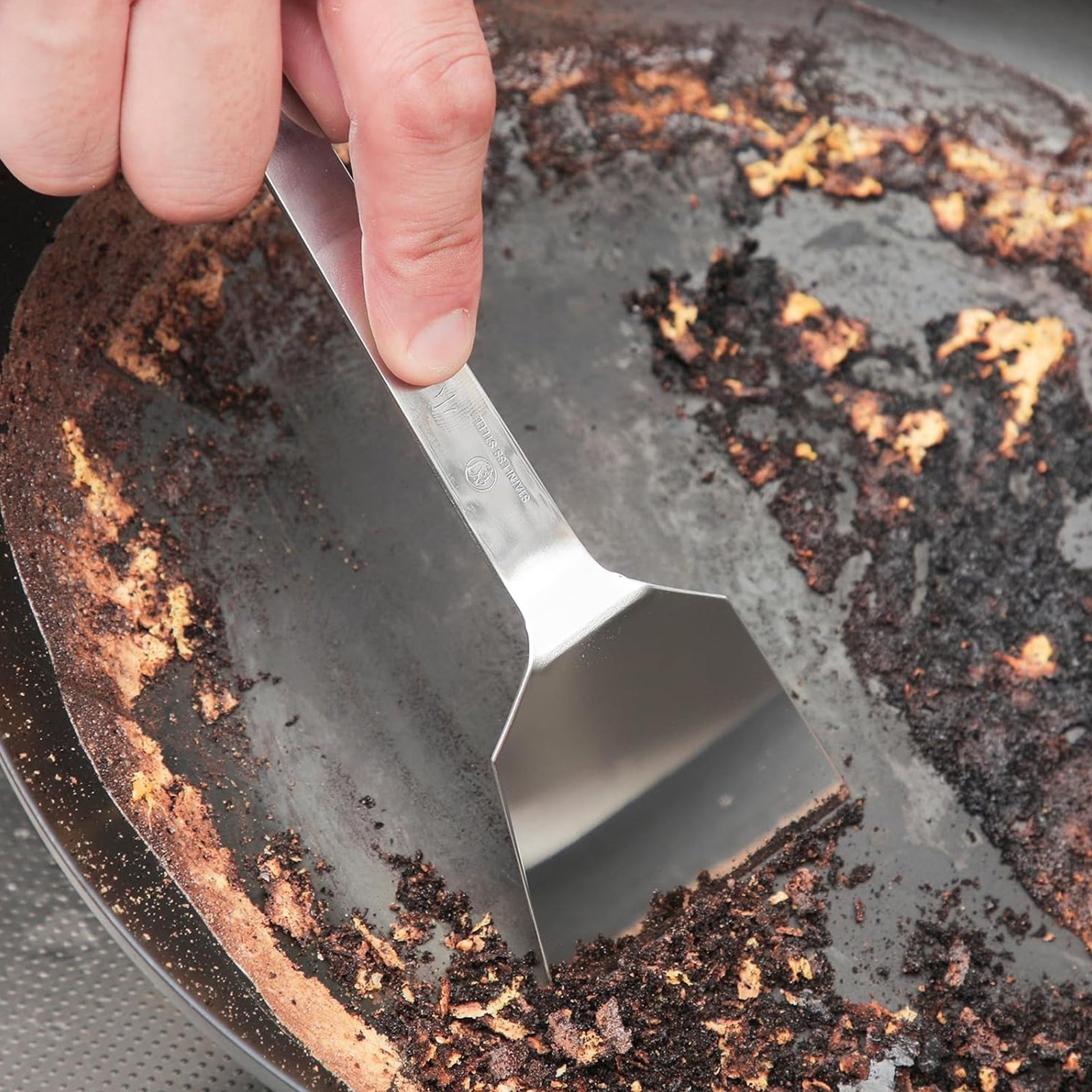 お手入れにヘラ?と思う方もいらっしゃるかもしれませんが、鉄フライパンを使っている方にはおなじみですね。ちょっと焦げ付いた時には金属ヘラでゴシゴシとっていただけます。お湯を沸かしていただいてふやかしたら、だいたいの焦げ付きはとれます。