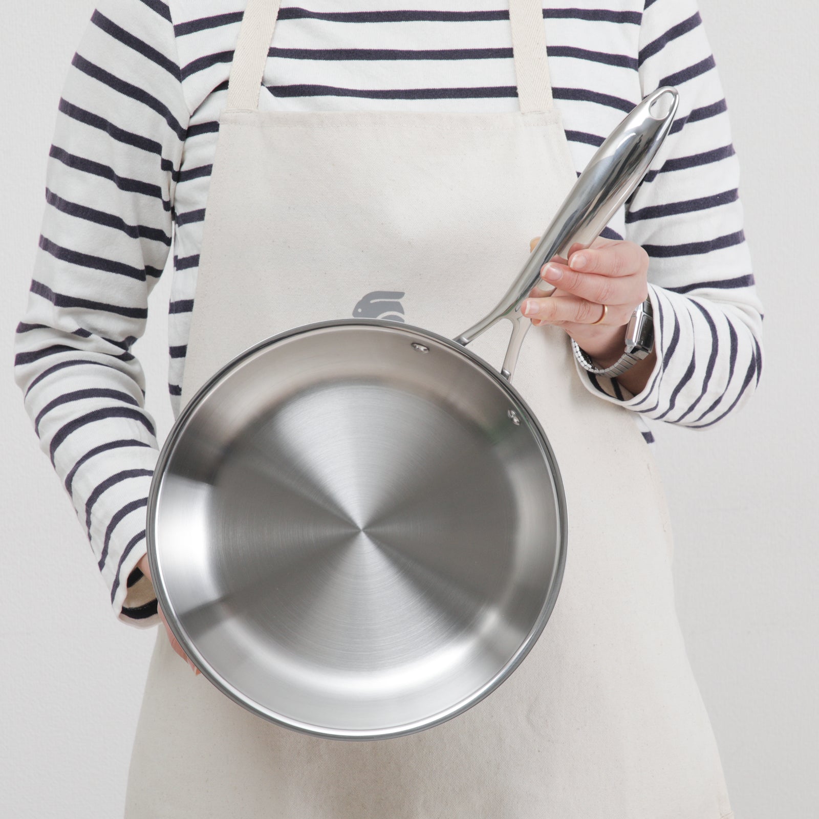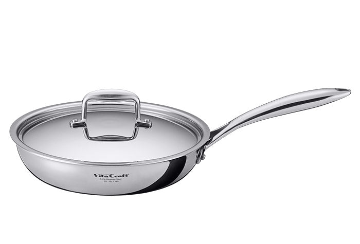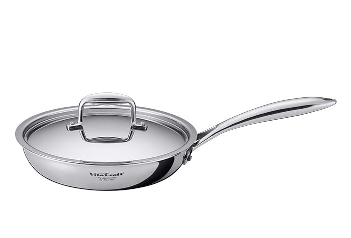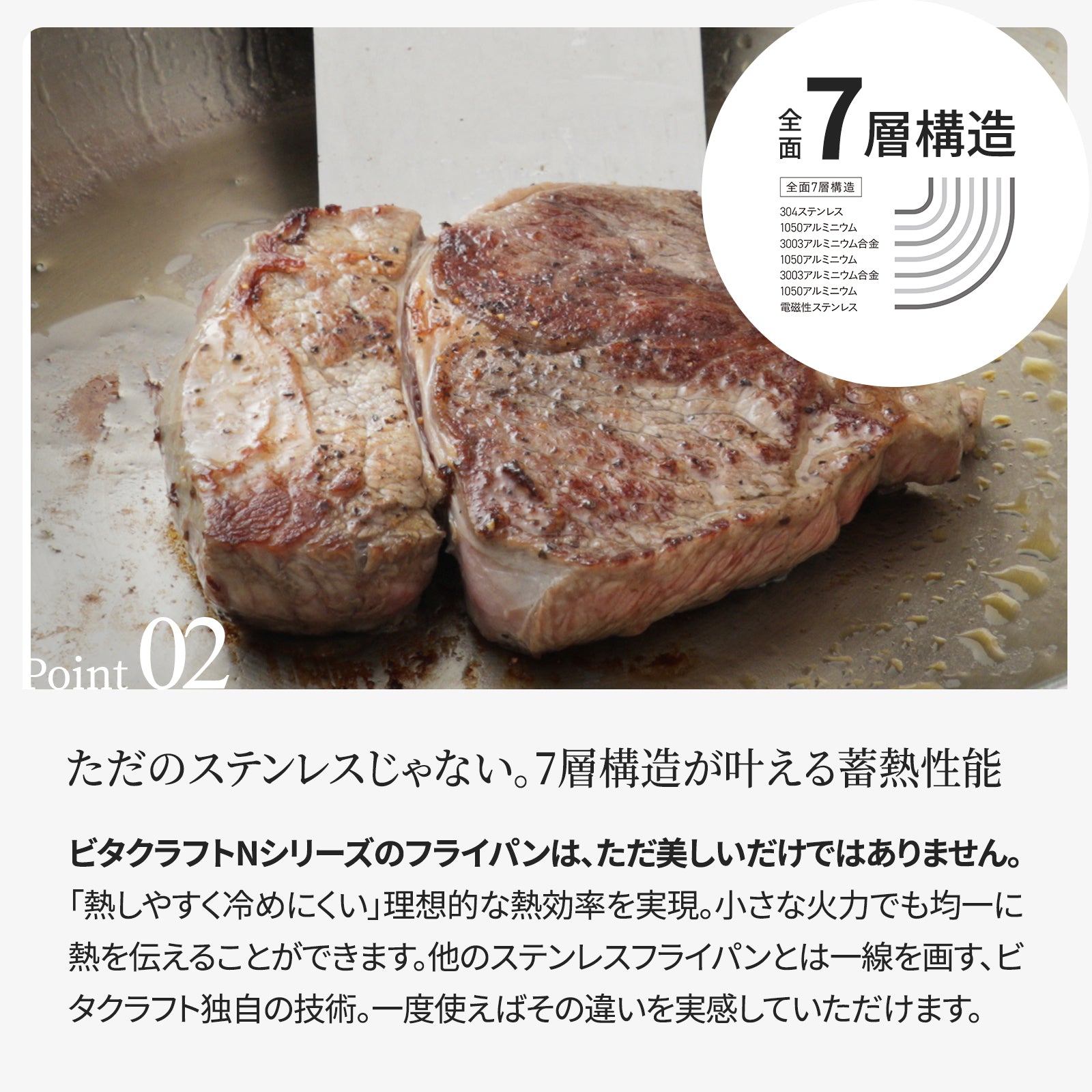 ビタクラフトNシリーズのフライパンは、 ただ美しいだけではありません。 その核となるのは、こだわりの7層構造。ステンレスとアルミを重ねることで「熱しやすく冷めにくい」理想的な熱効率を実現。小さな火力でも均一に熱を伝えることができます。例えば、野菜炒めはシャキシャキ、お肉は外はカリッと、中はジューシーに。火力を均一に伝え、食材の旨味を最大限に引き出すから、いつもの料理が格段に美味しく仕上がります。他のステンレスフライパンとは一線を画す、ビタクラフト独自の技術。一度使えば、その違いをきっと実感していただけるはずです。 |