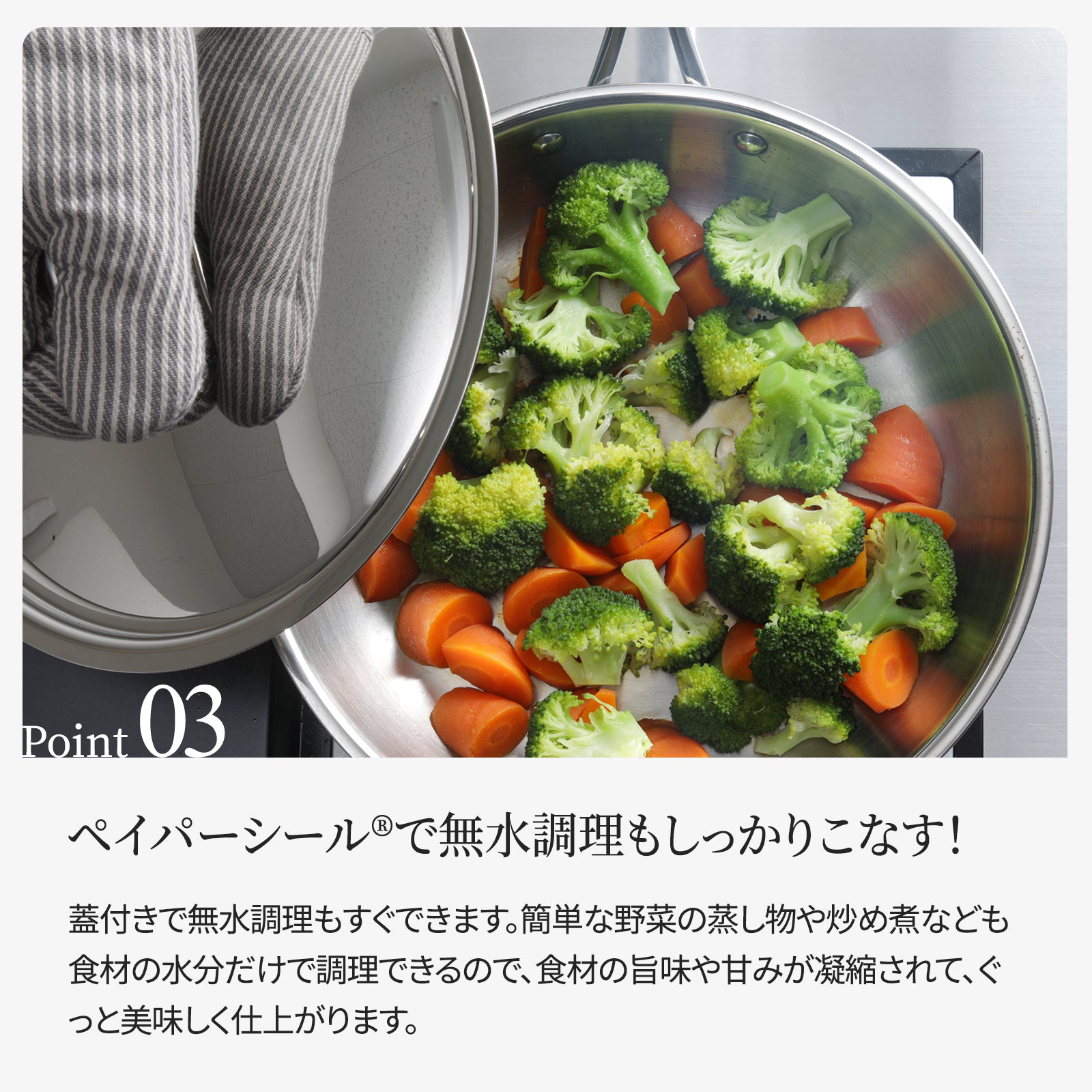 蓋付きで無水調理もすぐできます。簡単な野菜の蒸し物や炒め煮なども食材の水分だけで調理でき、食材の旨味や甘みが凝縮されて、ぐっと美味しく仕上がります。 |